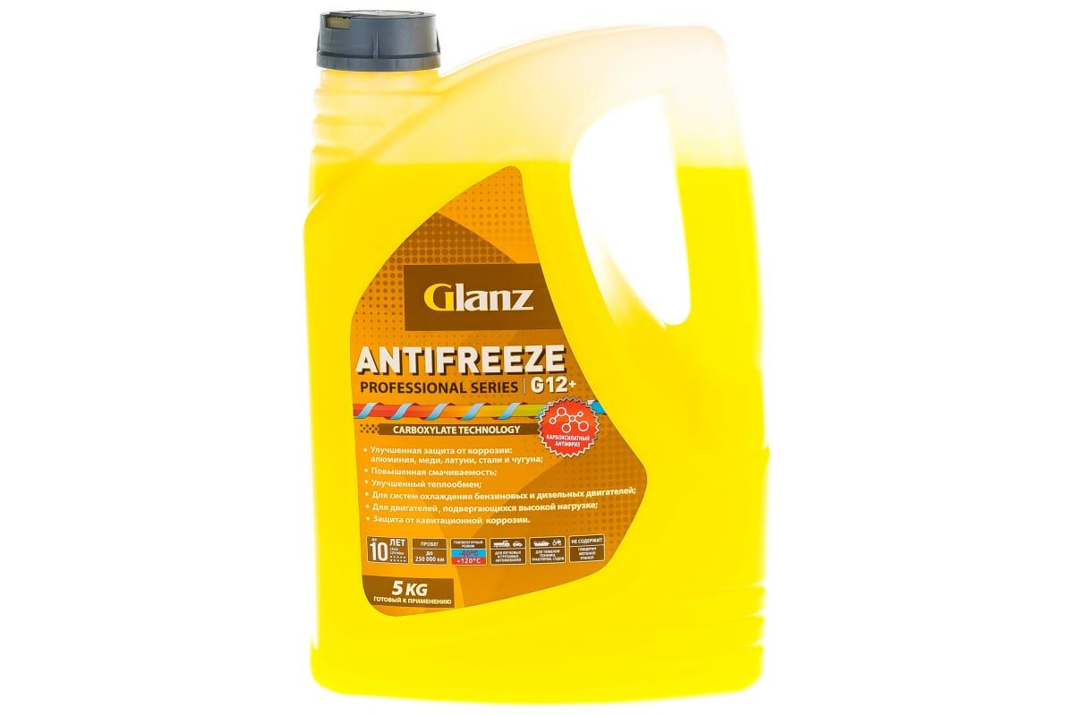 Антифриз (желтый; 5 кг) G-12+ Carboxylate PRO Glanz GL014 - рекомендован для систем охлаждения современных бензиновых и дизельных моторов, подвергающихся высокой нагрузке, в том числе с алюминиевыми деталями. Вполне вероятно использование в большинстве марок отечественных и иностранных автомобилей.