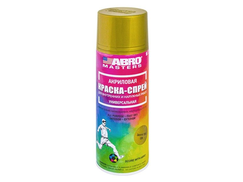 Быстросохнущая акриловая краска-спрей ABRO MASTERS. Цвет: золото 18К. Используется для окраски, ремонта и художественного оформления. Предназначена для окрашивания металлических, деревянных, бетонных и прочих поверхностей; даёт стойкие красочные цвета; обеспечивает прекрасный блеск; после высыхания не токсична; подходит для внутренних и наружных работ; не выгорает на солнце; расход — 1 баллон на 1-2 кв. м. (так же зависит от состояния окрашиваемой поверхности, расход краски может быть как меньше, так и больше; в некоторых случаях следует загрунтовать окрашиваемую часть); широкая цветовая палитра. Масса нетто (краски без баллона/упаковки): 226 г (272 мл). Объем баллона: 400 мл.